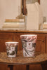 Dressed in hand-blown glass with raspberry and blue-grey hues, the Manon scented candle reveals delicate marbling that floats across its surface like suspended leaves, each vessel bearing the artisan's gesture with impressionist softness.